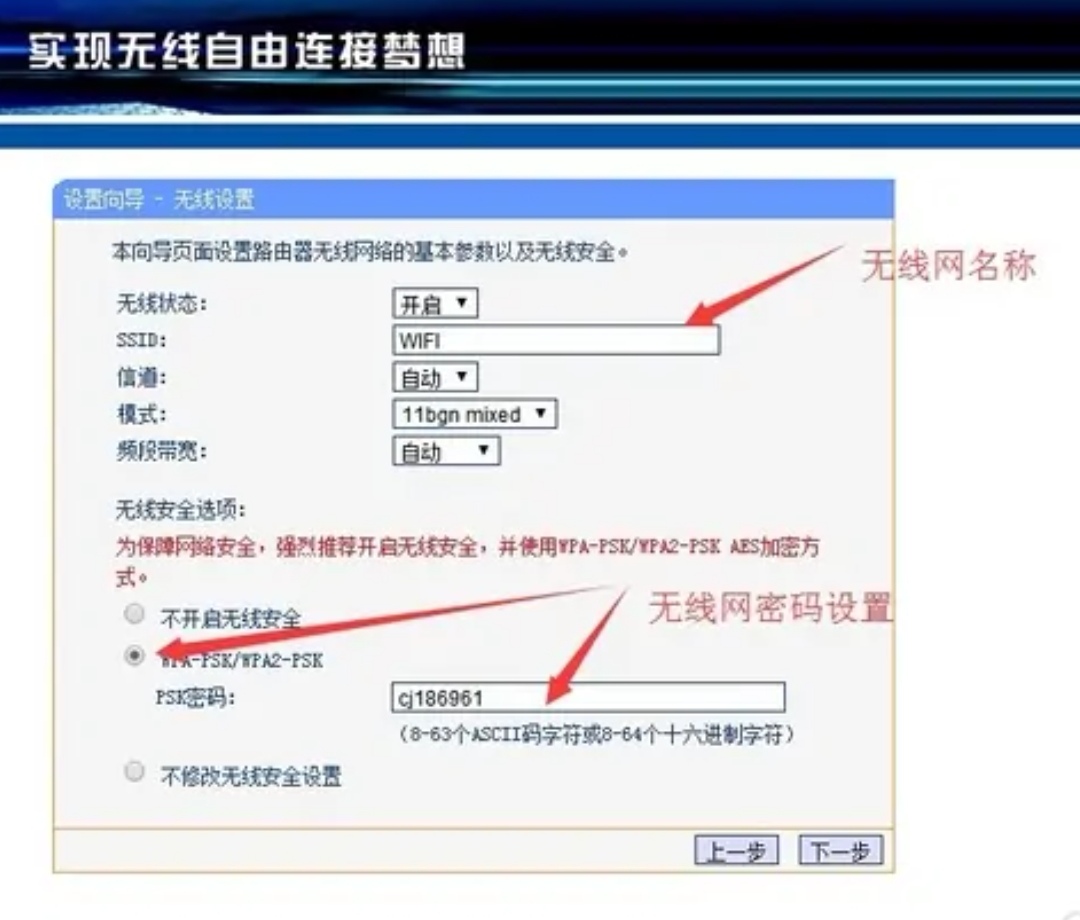 点击下一步,设置无线网名称SSID和密码,一般采用WPA2-PSK加密,选择完成,就建立了家庭WiFi网络,