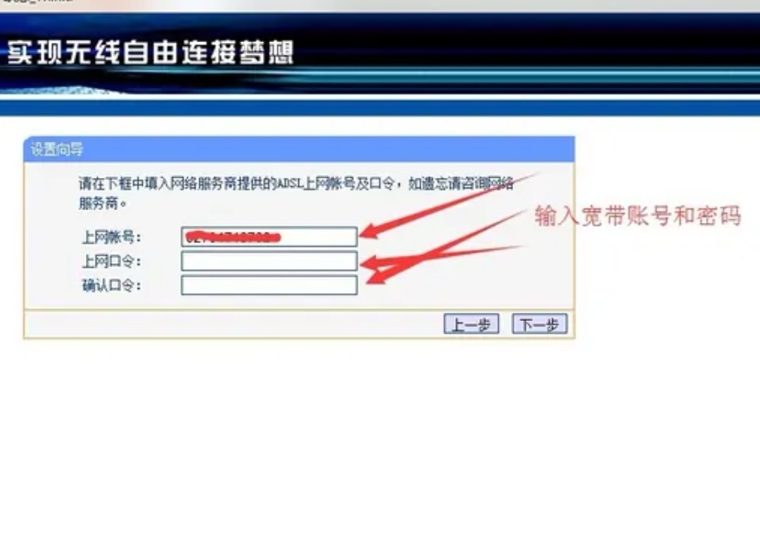 5.输入从网络服务商申请到的账号和密码,输入完成后直接下一步;