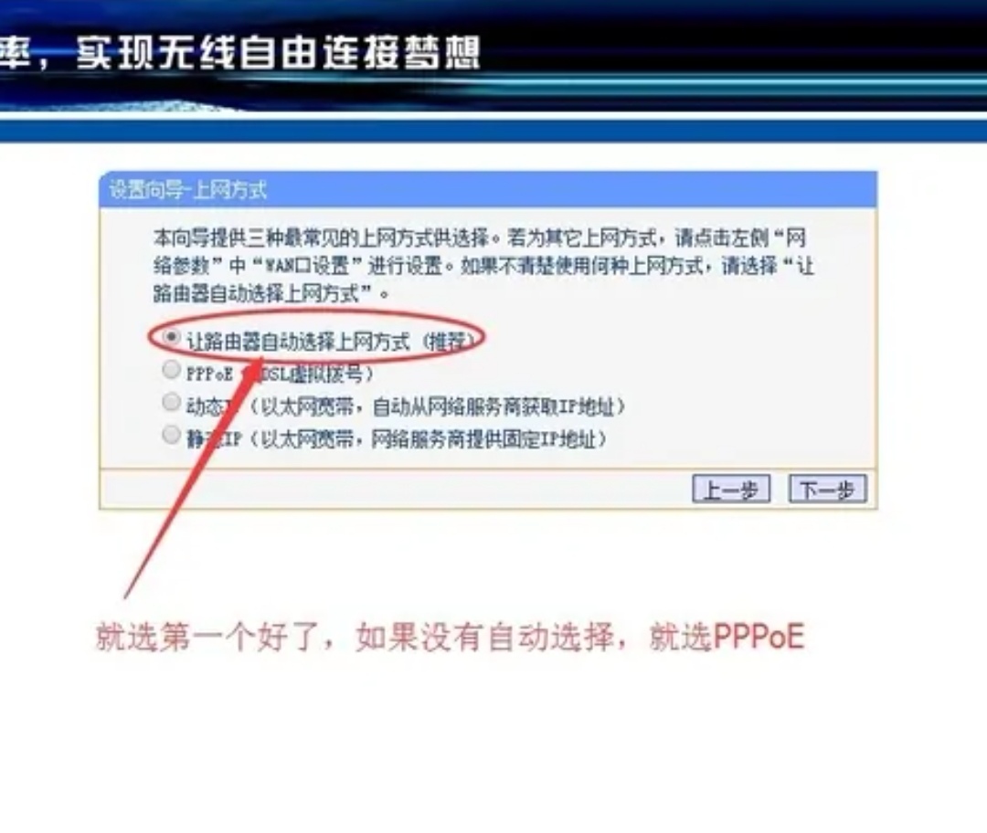 选择“让路由器自动选择上网方式”选项,如果没有自动选择,就选PPPoE选项,