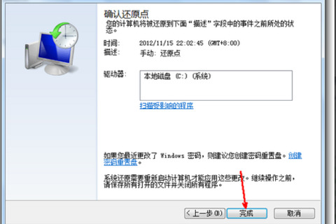 6.点击确定之后,将会出现一个确认的页面,上面也会显示很多关于还原的信息,我们只要确保它没有错误就可以了。然后点击完成按钮。这样系统还原也就开始了。当系统完成了还原之后电脑会自动的重启,在重启的时候我们要进行相关的还原操作。