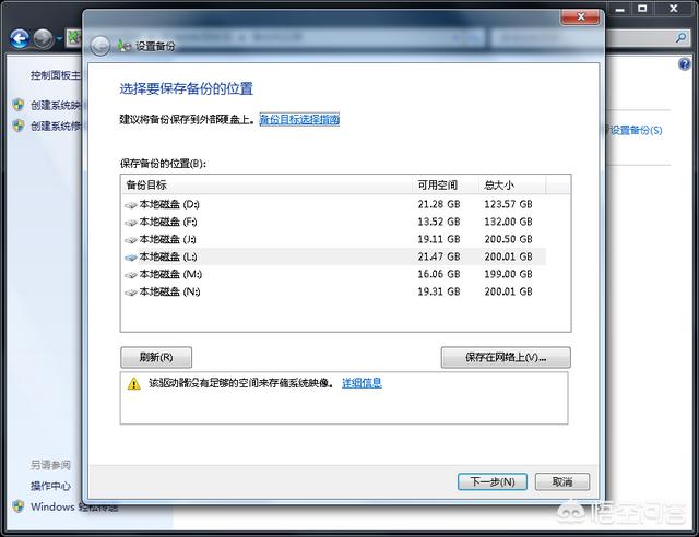 在打开该界面的同时会首先弹出一个“正在查找备份设备”扫描窗口,等待扫描完毕,选择备份的系统映像的保存位置,可以是在硬盘上,也可以是在DVD光盘上或网络位置上。一般情况下我们都保存在硬盘上,保存位置的硬盘分区需要是NTFS格式化。如果你有大容量的移动硬盘,在刚才点击“系统映像备份”之前先插上,然后在这里就可以把保存备份的位置选择移动硬盘。而且系统也建议把系统映像备份到另一物理磁盘,例如移动硬盘或U盘上。