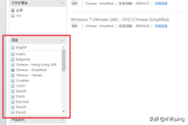6、现在开始筛选你需要的系统镜像。在右边结果栏中语言栏的English去掉,勾选Chinese-Simplified(简体中文)其他的语言有兴趣的自己去了解。