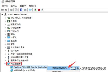 2、在设备管理器中,展开网络适配器,右键当前的网卡选择“更新驱动程序”。