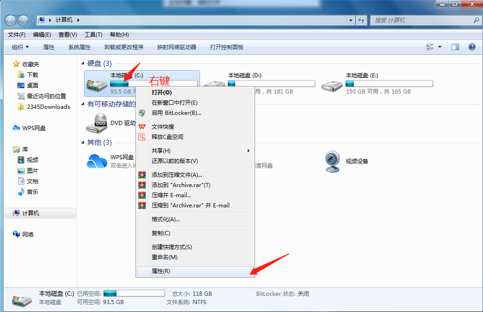 打开计算机-鼠标右键点c盘--点属性