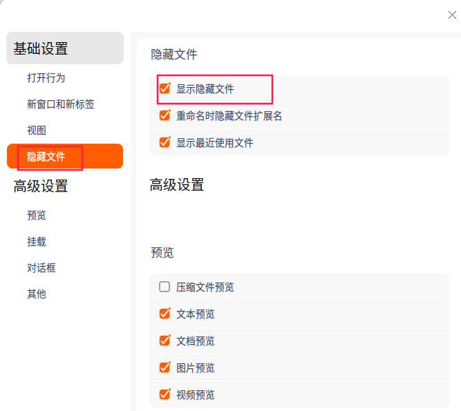 在左侧选择点击隐藏文件,再在右侧界面勾选显示隐藏文件。