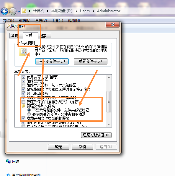 点击【选项】按钮,在跳出的界面中点击【查看】页签,在【查看】页签下的高级设置窗口中往下滑,找到“显示隐藏的文件、文件夹和驱动器”并选择