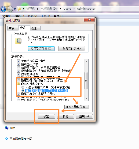 点击【显示隐藏的文件、文件夹和驱动器】,点【应用】,再点【确定】。