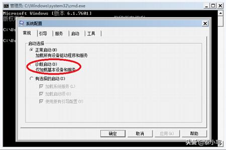 6、打开之后我们选择诊断启动,这样做的用处就是去掉所有的不必须强制执行任务,仅加载系统启动任务。