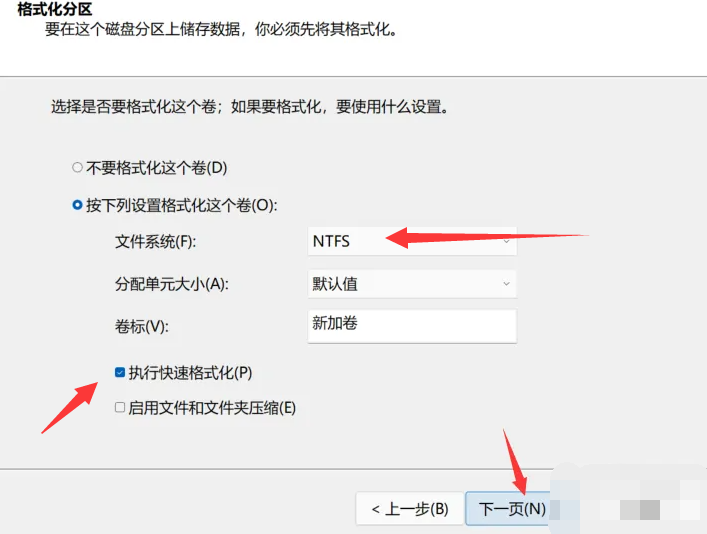 8.选择分区的格式执行快速格式化,点击下一步。