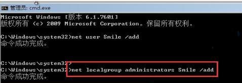 然后再输入一个net localgroup administrators Smile /add的命令,这个命令的功能是将新增的这个账户升级成管理员;