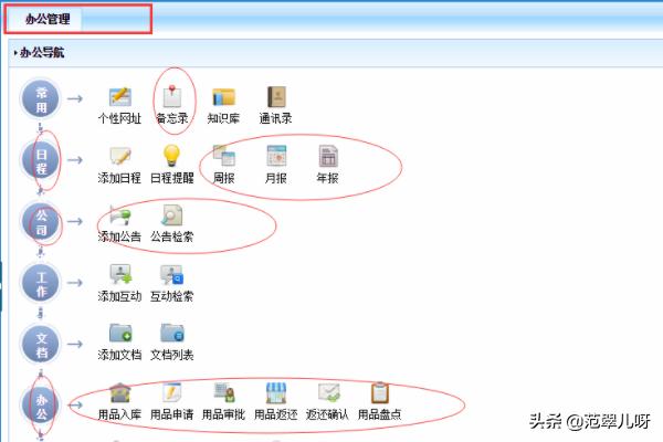 5、点击办公管理,在操作界面常用工具中会出现个性网址、备忘录、知识库、通讯录以及日程报表、公司公告、工作互动、文档、办公用品、会议室等等管理操作步骤。