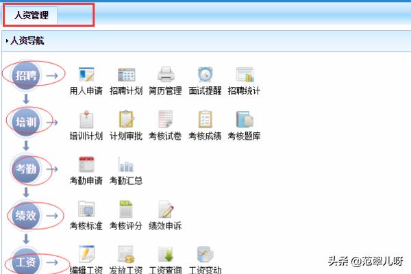 6、点击人资管理,界面会出现人资日程需要管理的事务,如招聘、培训、考勤、绩效、工资等等管理步骤。