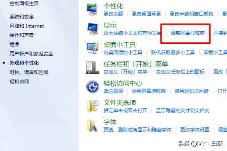 3、打开控制面板,然后点击“硬件和声音”,接着点击显示栏里的“调整屏幕分辨率”进入操作页面。然后点击在新页面中点击“调整分辨率”进入操作页面,然后调整电脑分辨率就可以了。(这里我们也可以点击其中一个选项,就会使阅读屏幕上的内容更容易。)