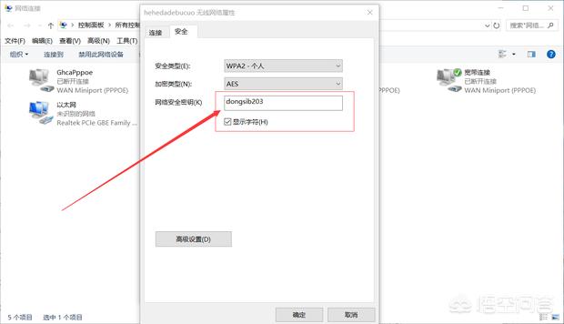 选择【无线属性】选项,切换到【安全】选项卡,在下边的【显示字符】前面打勾,此时就可以看到自家WiFi密码。