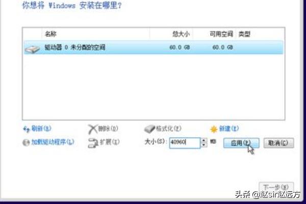 9、输入要建立的分区大小,如果固态硬盘容量小,大小直接默认,点击应用,建立一个分区,如果要2个以上分区,就自行设置大小,win10至少50G以上C盘空间,1G=1024MB,点击应用;