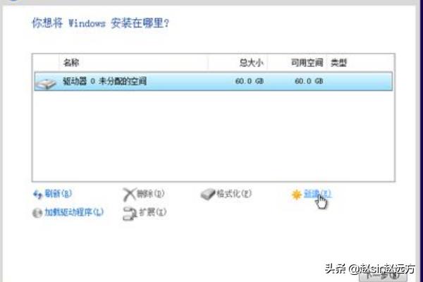 8、不需要重新分区的直接看第12步,进入到分区界面,如果之前有系统,要先备份好数据,然后删除所有分区,只剩下一个未分配的空间,选择未分配的空间,点击【新建】;