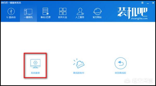 2、在装机吧的主界面,点击一键装机下方的系统重装。