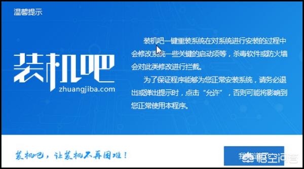 1、打开装机吧一键重装系统软件,出现温馨提示窗口,退出全部的杀毒软件,点击我知道了。