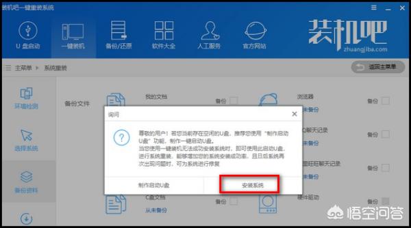 5、然后选择需要备份的数据文件,建议在安装前手动备份,否则很耗费时间,点击下一步后出现询问窗口,选择安装系统。