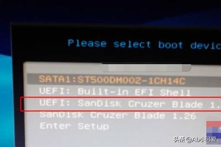 2、在需要重装系统的笔记本电脑上插入pe启动盘,重启后不停按F12或F11或Esc等启动快捷键。调出启动菜单对话框,选择识别到的U盘选项,一般是U盘名称或者带有USB字样的,比如SanDisk,如果要uefi模式下安装,选择带UEFI模式的项,按回车键进入。