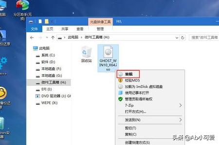 7、接着打开此电脑—微PE工具箱,右键win10系统iso镜像,选择【装载】,如果没有装载,右键—打开方式—资源管理器。