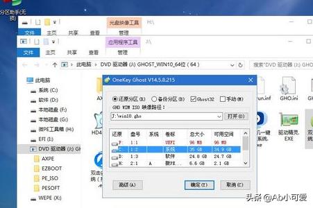 8、双击【双击安装系统.exe】,运行安装工具,选择【还原分区】,GHO WIM ISO映像路径会自动提取到win10.gho,接着选择安装位置,一般是C盘,或者根据卷标或总大小来判断,选择之后,点击确定。