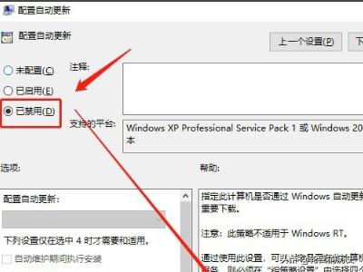 6、双击“配置自动更新”按钮,在配置自动更新页面中,选择“已禁用”按钮,如图所示。