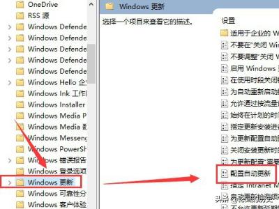 5、打开Windows组件文件夹,在文件夹中找到“Windows更新”文件,在Windows更新文件夹中选择“配置自动更新”按钮。
