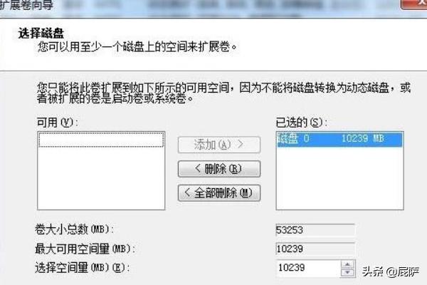 4、压缩完成后,会有一个10G的可用空间在磁盘列表显示出来,现在只需要将这10G压缩卷合并到C盘就OK了。右击c盘选择“扩展卷”即可执行扩展卷向导窗口,选择可用空间10GB的磁盘,再点击“下一步”即可。如下图。