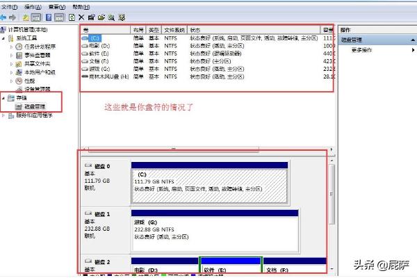 2、在计算机管理窗口中选择“储存”-“磁盘管理”,在右边就会显示你的分区情况了,如下图。