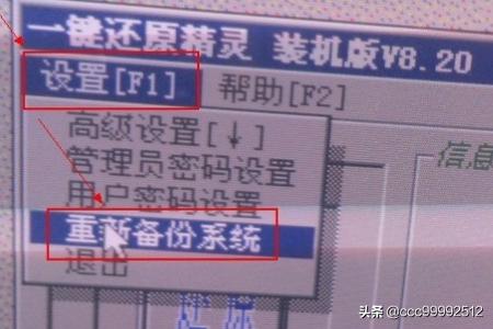 5、在出现这个界面后,点击“设置”,在打开的菜单中,选择“重新备份系统”。