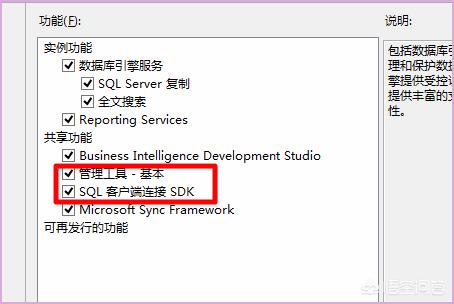 6、然后在弹出来的界面中,除乐“管理工具-基本”和“SQL 客户端连接”以外,全部取消打勾,点击下一步。