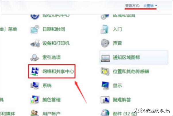 2、第一步:点击开始菜单中的控制面板功能,接着在控制面板界面将查看方式设置为“大图标”后,找到并点击“网络和共享中心”选项;
