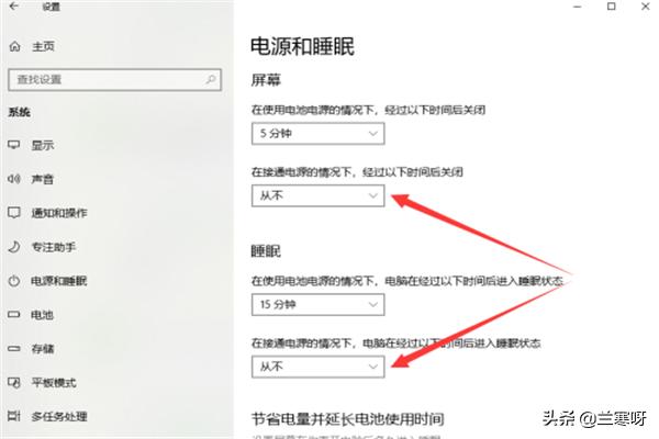 5.在接通电源的情况下,我们将屏幕和睡眠都设置为“从不”。使用电池的情况下,设置可以保持不变。