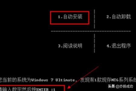 4、进入激活操作页面,可以看到工具的4大功能。然后再下面的工具选择项,输入数字“1”,然后回车。