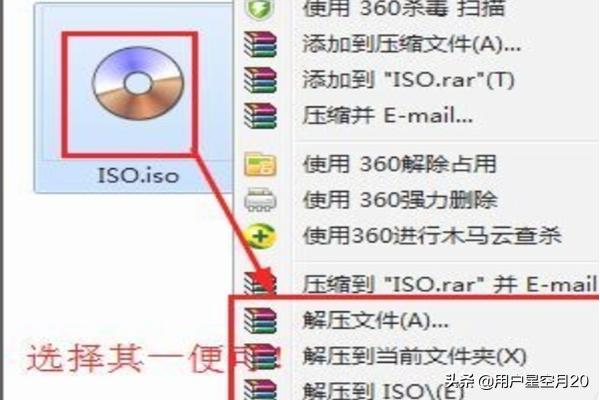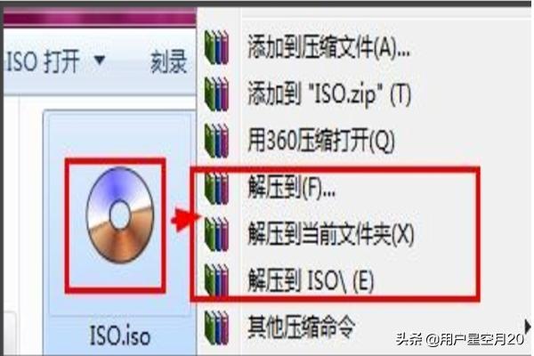 第六步,使用解压软件进行打开:(一个是winrar,另一个是360压缩。)首先选中自己想要打开的ISO文件。然后点击鼠标的右键,在弹出的菜单中选择winrar的“解压到...”。