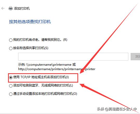 6、然后在新的页面勾选使用tcp/ip地址或者主机名添加打印机,然后点击右下角下一步;