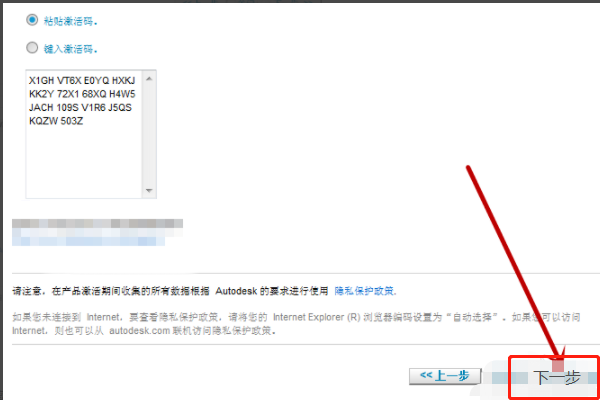 返回到cad的注册界面,点击【输入激活码】,然后把激活码粘贴在下方。