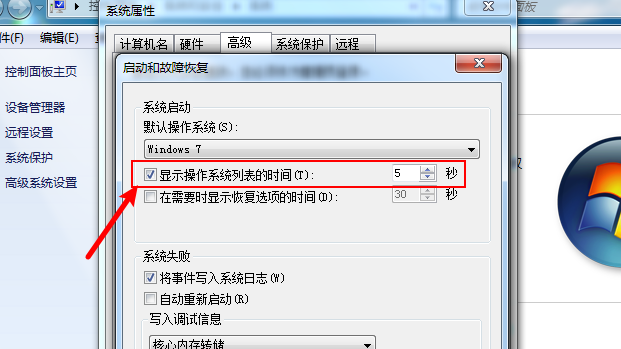 5、在启动和故障窗口,取消勾选“显示操作系统列表的时间”,就可以关闭启动管理器了