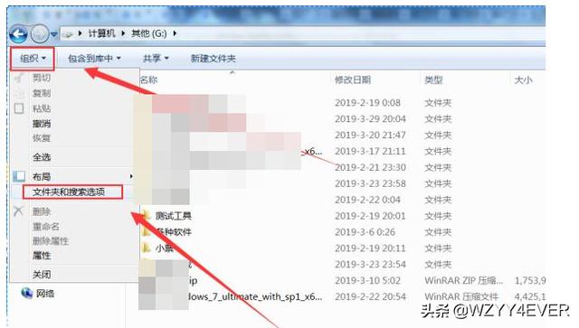 1、在需要显示隐藏文件夹的磁盘点击左上角的“组织”,选择“文件夹和搜索选项”。