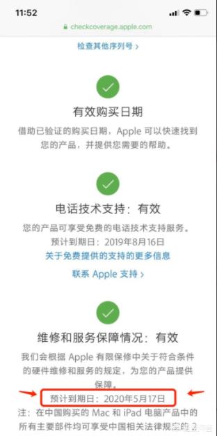 10、在出现的信息里可以看到手机的维修和服务保障情况,靠下的位置有个“预计到期日”,用这个时间减去一年就是当时激活手机的时间。