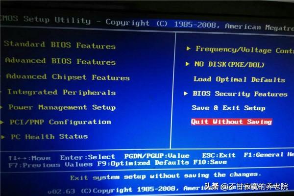 具体操作方法如下:1.如果没有更改BIOS设置,可以按ESC或者屏幕最后的Exit选项退出。BIOS主菜单上有退出的选项,主要功能键还有说明,选择【EXITWITHOUTSAVING】即可退出BI...